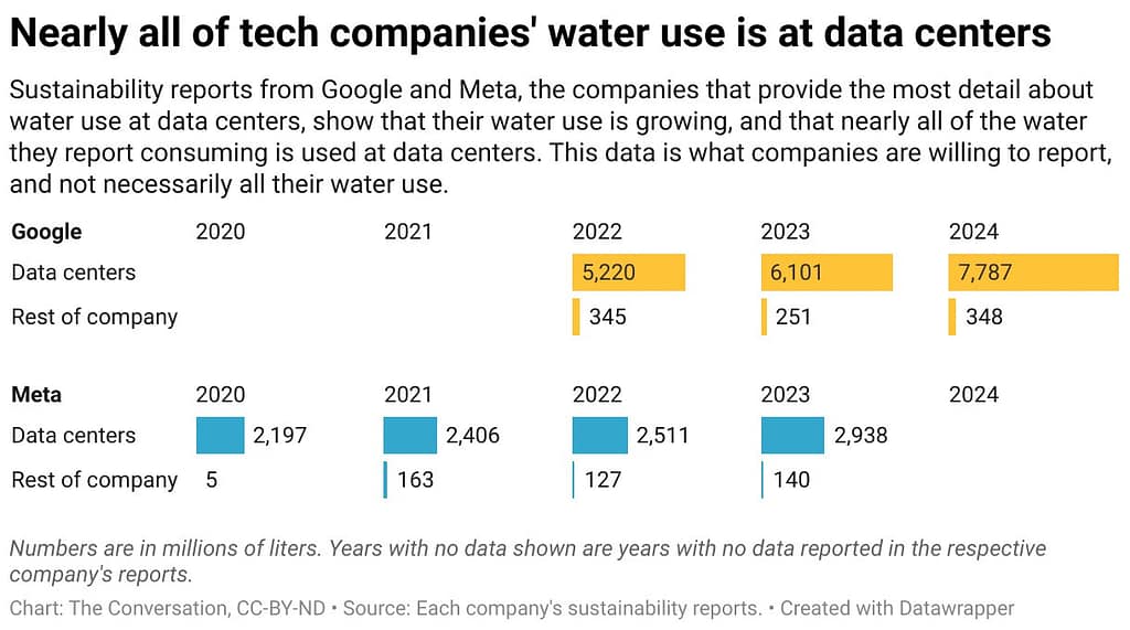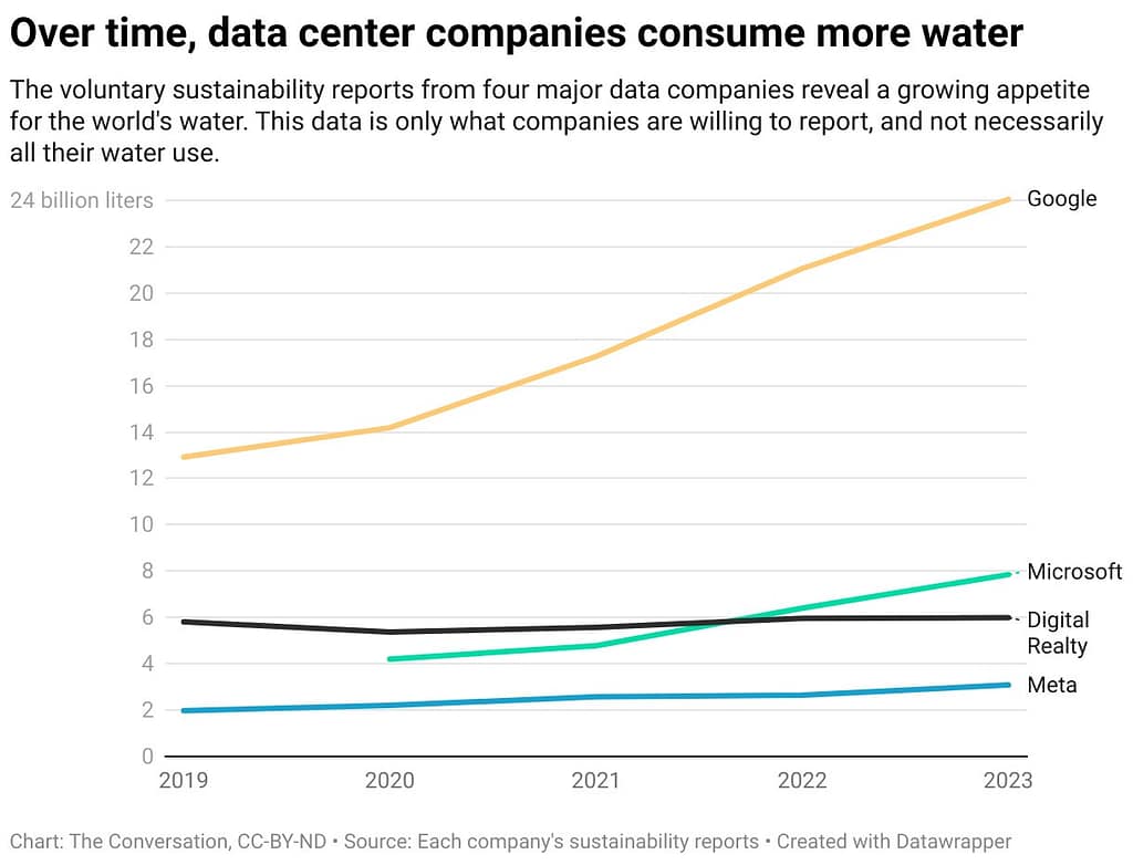 In general, corporate sustainability reports offered the most access and detail – including that in 2024, one data center in Iowa consumed 1 billion (3.8 billion liters) gallons of water – enough to supply all of Iowa’s residential water for five days.
