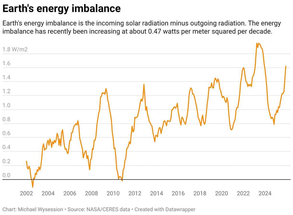 Earth’s energy imbalance: Other sources can disrupt the natural balance between the amount of sunlight that reaches Earth and the lesser amount radiated back to space. A recent study found that Earth’s energy uptake surged and temperatures rose quickly when a rare three-year La Niña in 2020-2022 shifted to El Niño in 2023-2024.